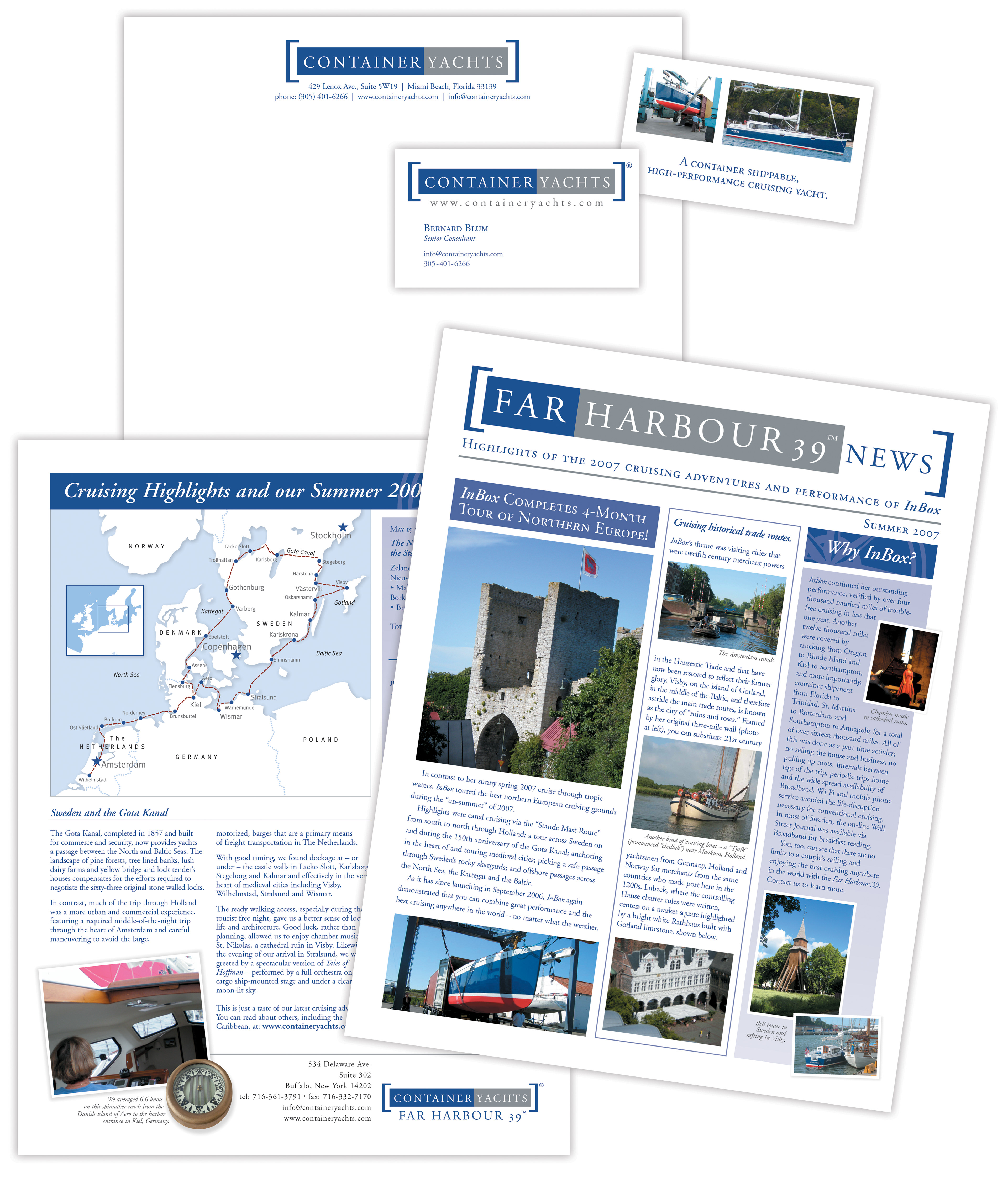 Letterhead, two-sided business card, and newsletter for a creatively-designed high-end cruising yacht which fits inside a shipping container for world-traveling purposes.
