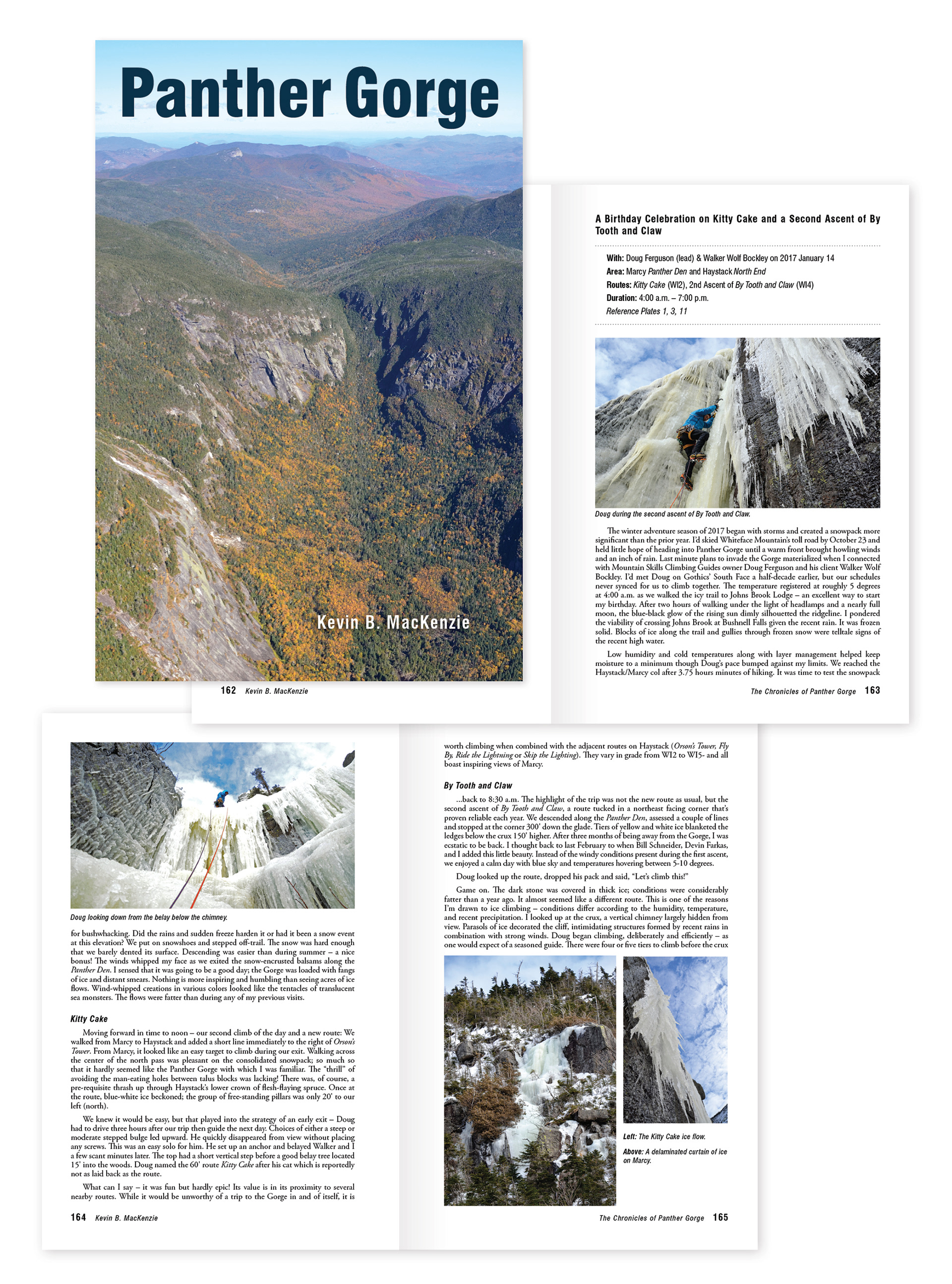 Cover and content from a 288-page paperback book chronicling the author's decade of journeys to an Adirondack rock and ice climbing destination.
