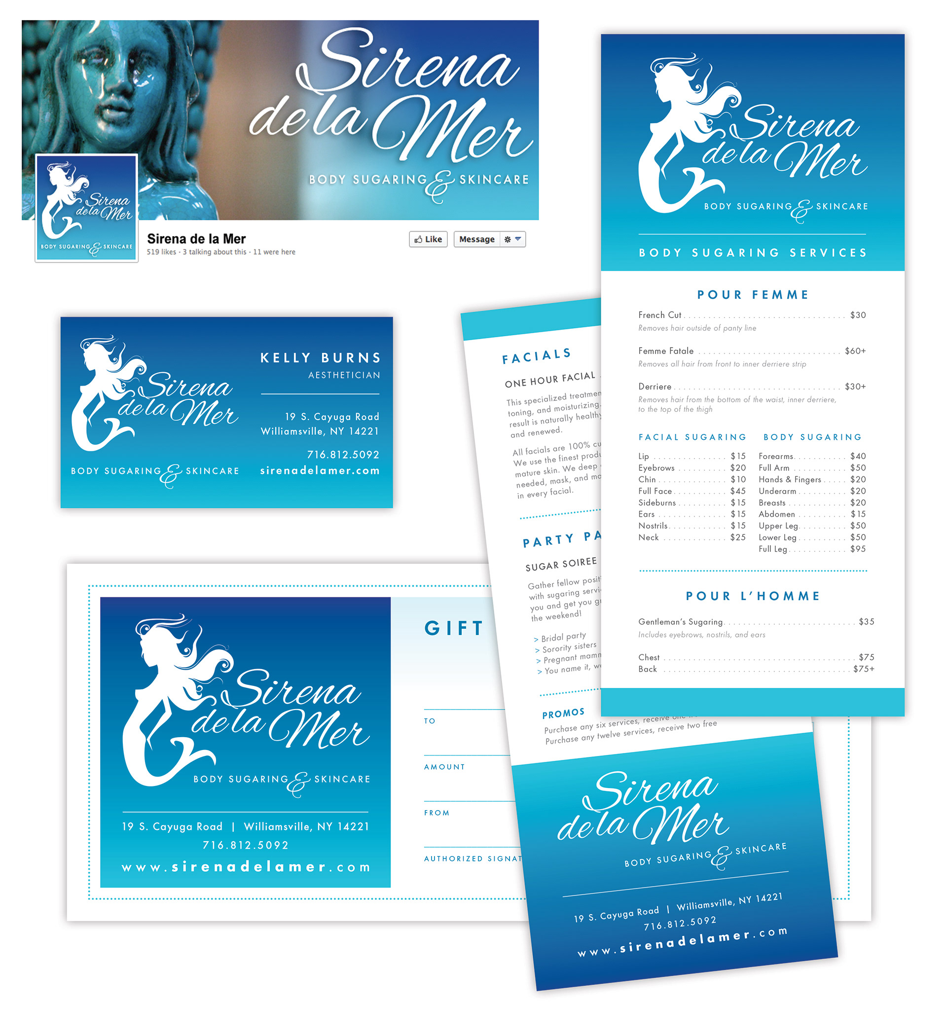 Identity update for an aesthetician, including facebook imagery, business card, gift certificate, and menu of services.